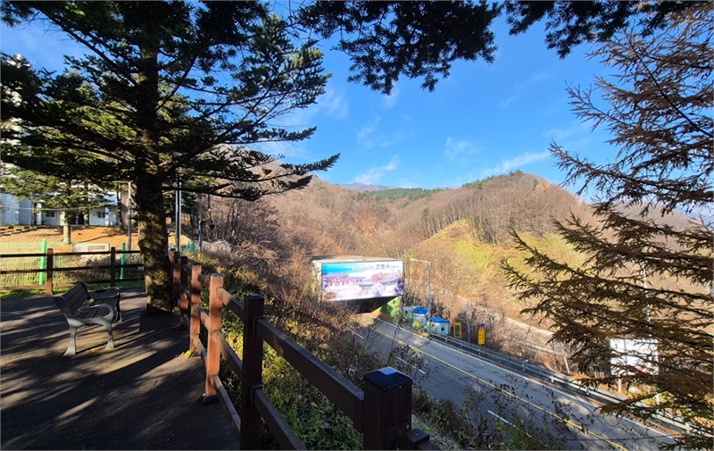 바람이 솔솔 지나가고, 멀리 내려다보이는 국도와 계곡 풍경이 자연스럽게 그림처럼 이어진다.